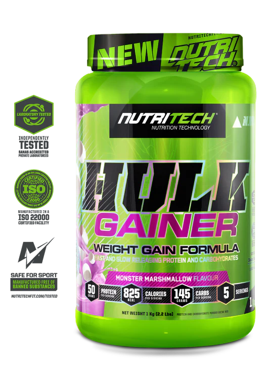 NutriTech® Hulk Gainer is a high-calorie weight gain supplement designed to help athletes and fitness enthusiasts bulk up and build muscle mass. With a blend of fast and slow-digesting proteins, complex carbohydrates, and healthy fats, Hulk Gainer provides the nutrients your body needs to support muscle growth and recovery.